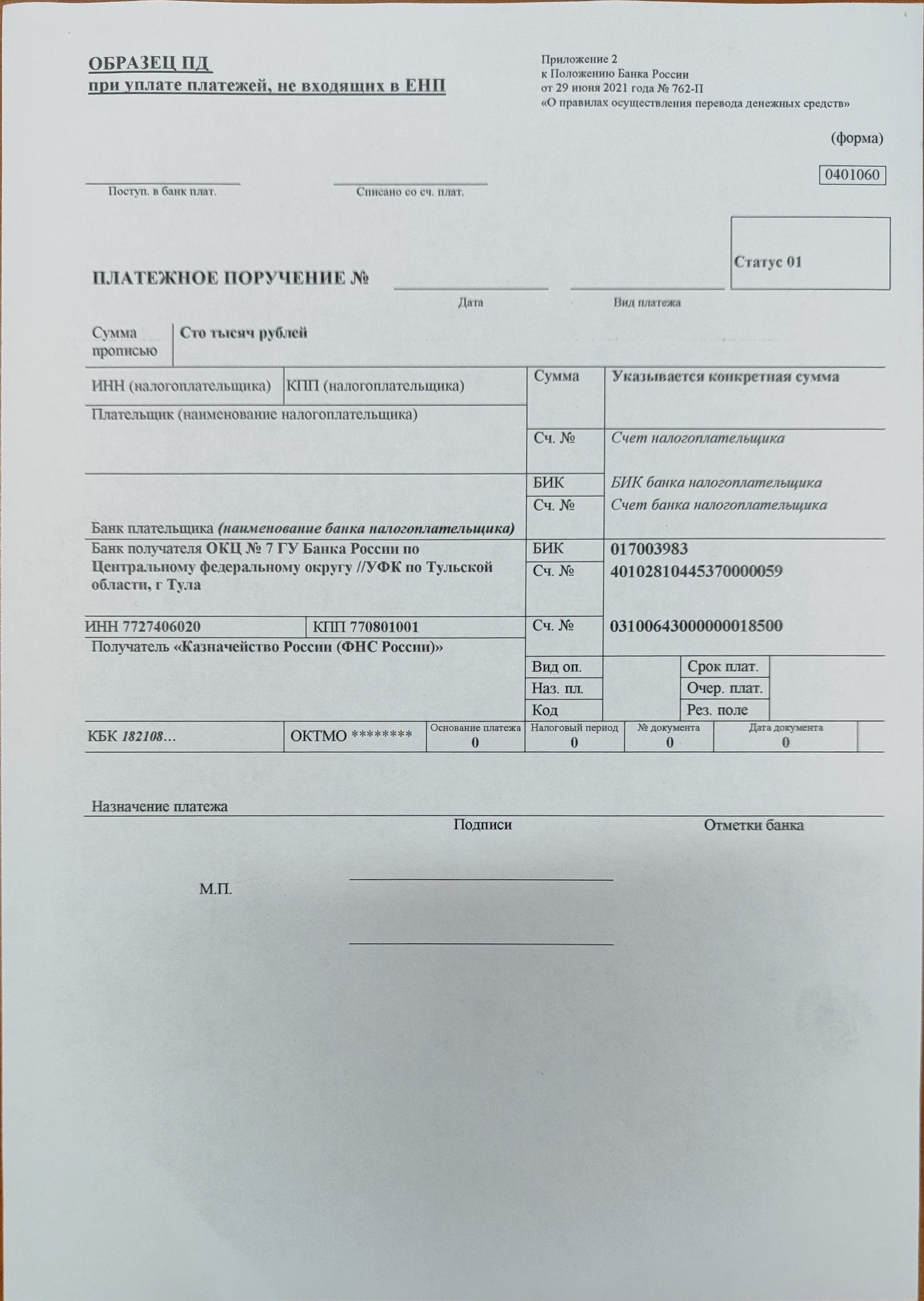 С 27 октября 2025 года изменилось наименование подразделения Банка России, осуществляющего функции расчётного и кассового обслуживания. В связи с чем в платёжных документах в графе "Банк получателя" необходимо указывать: "ОКЦ № 7 Банка России по Центральному федеральному округу//УФК по Тульской области, г. Тула".